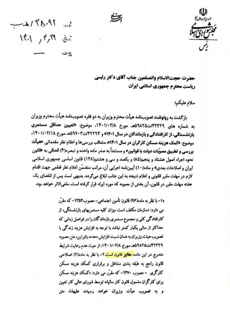 به گزارش نجواخبر، بیست و نهم تیرماه، محمدباقر قالیباف (رئیس مجلس) در نامهای به دولت، حق مسکن ۵۵۰ هزار تومانی و مصوبهی افزایش مستمری بازنشستگان را مغایر با قانون دانست و از دولت خواست که این دو مصوبه اصلاح شود.