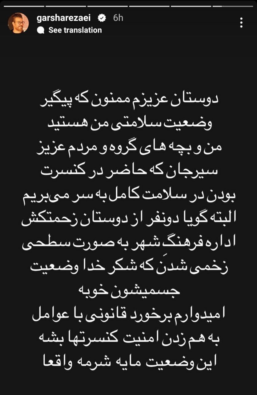 «گرشا رضایی» که کنسرتش به علت حمله عوامل ناشناس برهم خورد در واکنش به این اتفاق با بیان اینکه خود و گروهش در سلامت هستند نوشت: امیدوارم با عوامل بر هم زدن امنیت کنسرتها برخورد قانونی شود.