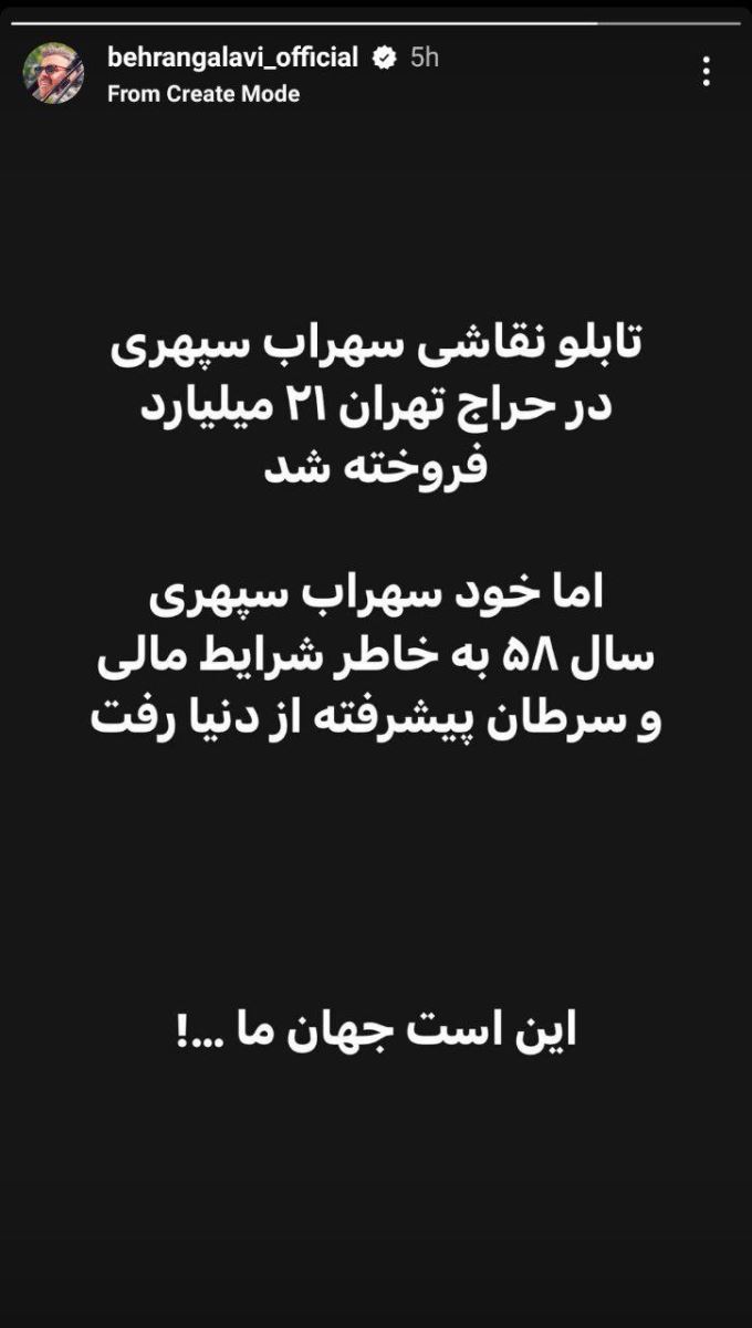 بهرنگ علوی متن قابل تاملی را درباره قیمت نقاشی سهراب سپهری در اینستاگرام منتشر کرد.