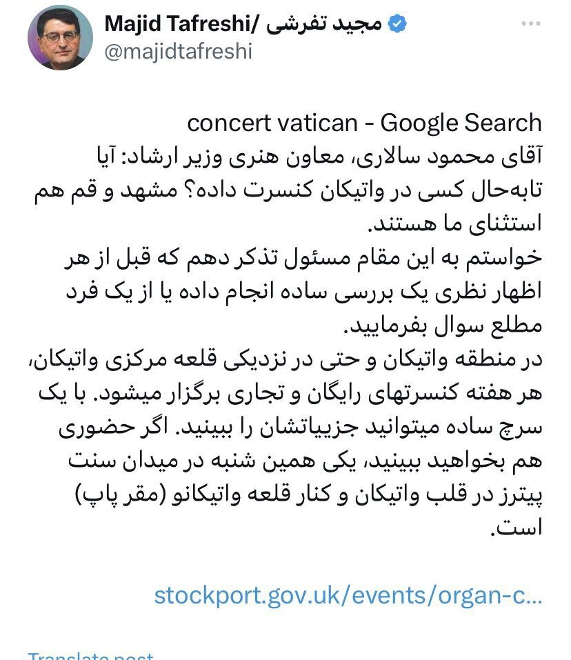 مجید تفریشی پژوهشگر تاریخ در پاسخ به این نظر در توییتی نوشت: آقای محمود سالاری، معاون هنری وزیر ارشاد: «آیا تابهحال کسی در واتیکان کنسرت داده؟ مشهد و قم هم استثنای ما هستند. خواستم به این مقام مسئول تذکر دهم که قبل از هر اظهار نظری یک بررسی ساده انجام داده یا از یک فرد مطلع سؤال بفرمایید. در منطقه واتیکان و حتی در نزدیکی قلعه مرکزی واتیکان، هر هفته کنسرتهای رایگان و تجاری برگزار میشود.