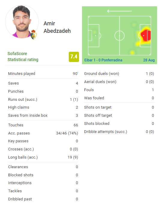 عابدزاده در هفته سوم لیگ دسته اول اسپانیا با وجود شکست آماری عالی از خود به ثبت رساند.