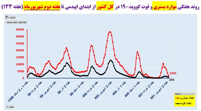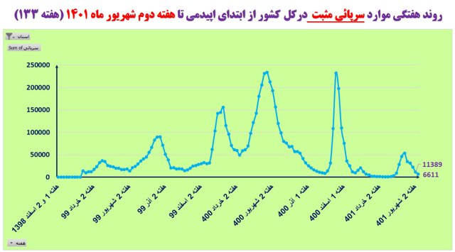 ‌در عین حال بر اساس گزارش مرکز مدیریت بیماری‌های واگیر وزارت بهداشت، در هفته ۱۳۳ همه‌گیری کرونا مصادف با هفته دوم شهریورماه ۱۴۰۱، تعداد موارد سرپایی مثبت شناسایی شده از ۱۱ هزار و ۳۸۹ مورد به ۶۶۱۱ مورد، تعداد موارد بستری جدید از ۳۵۳۷ مورد به ۱۹۴۳ مورد، تعداد موارد مرگ و میر از ۳۲۷ مورد به ۲۴۳ مورد رسیده است.