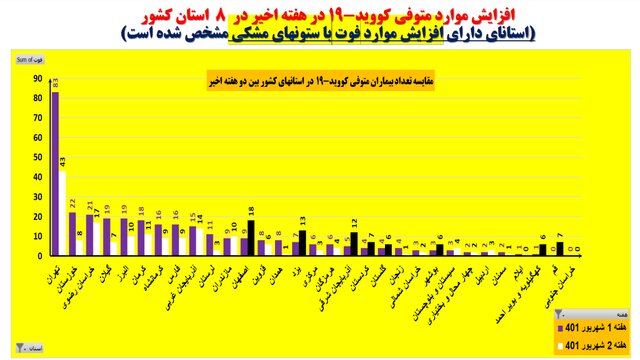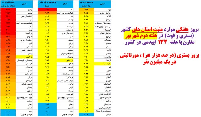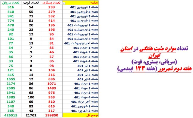 در عین حال در استان تهران نیز در هفته اخیر تعداد موارد مثبت شناسایی شده ۳۶۵ نفر، تعداد موارد بستری جدید ۳۱۷ نفر و تعداد موارد فوتی در هفته اخیر ۴۳ نفر بوده است.