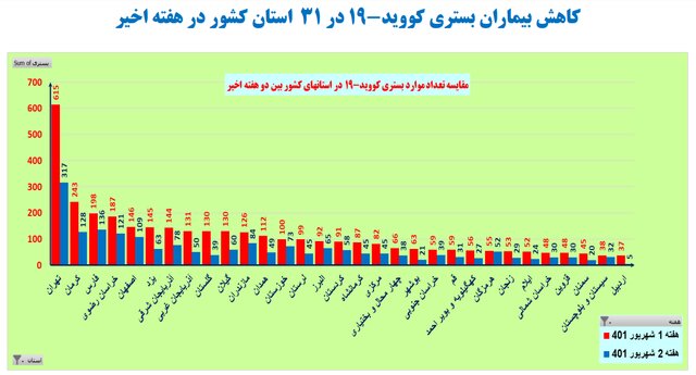 همچنین طبق اعلام وزارت بهداشت، کاهش بیماران بستری کووید ۱۹ در ۳۱ استان کشور در هفته اخیر گزارش شده است. این در حالی است که تعداد موارد فوتی کرونا در هفته اخیر در هشت استان اصفهان، یزد، آذربایجان شرقی، کردستان، گلستان، بوشهر، کهگیلویه و بویر احمد و قم افزایش داشته است.