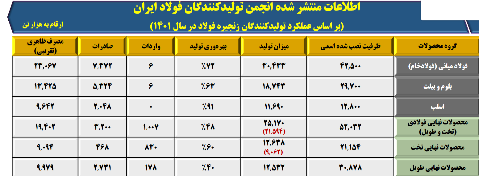 بر اساس داده‌های انجمن تولیدکنندگان فولاد ایران، در سال ۱۴۰۱ ( طبق جدول ذیل) و در نظرگیری ظرفیت نصب شده اسمی، تولید واقعی و مصرف ظاهری محصولات نهایی فولادی کشور، می‌توان دریافت که تعادلی بین میزان عرضه و تقاضا در محصولات فولادی برقرار بوده و مشکلی بابت تأمین نیاز بازارداخلی وجود ندارد. به عبارت دیگر اگر همه شرکت‌های تولیدکننده محصولات فولادی با تمام ظرفیت خود به فعالیت بپردازند و محصولات خود را عرضه کنند نه تنها کشور با کمبود مواجه نمی‌شود بلکه با مازاد عرضه نیز مواجه خواهد شد.