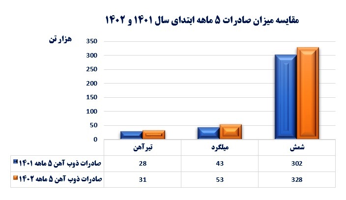 میــزان صــادرات شــرکت در ۵ ماه ابتدای سال چگونه بوده است ؟صادرات محصولات فولادی شرکت با توجه به کیفیت و اســتانداردهای جهانی به نقاط مختلف دنیا همچون کشورهای اروپایی در حال انجام میباشد. در حال حاضر کشــور عزیزمان ایران، رتبه دهم تولید فولاد در دنیا را دارد که ســهم شرکت از این میــزان ۸ درصد میباشــد . بالغ بــر ۵۰ درصد محصولات تولیدی شرکت روانه بازارهای صادراتی میشود. سهم صادرات محصولات شرکت از کل کشور در ۵ ماه ابتدای ســال ۱۴۰۲ حدود ۱۲ درصد میباشد که در مقایسه با ســهم تولید از میزان بیشتری برخوردار میباشد .. در این میان صادرات محصول تیرآهن ۱۱درصد، میلگرد ۲۳ درصد و شمش ۹ درصد نسبت به دوره مشابه در سال ۱۴۰۱ افزایش داشته است . میزان صادرات شرکت در ۵ ماه ابتدای سال ۱۴۰۲ بیش از ۴۴۰ هزارتن میباشد .