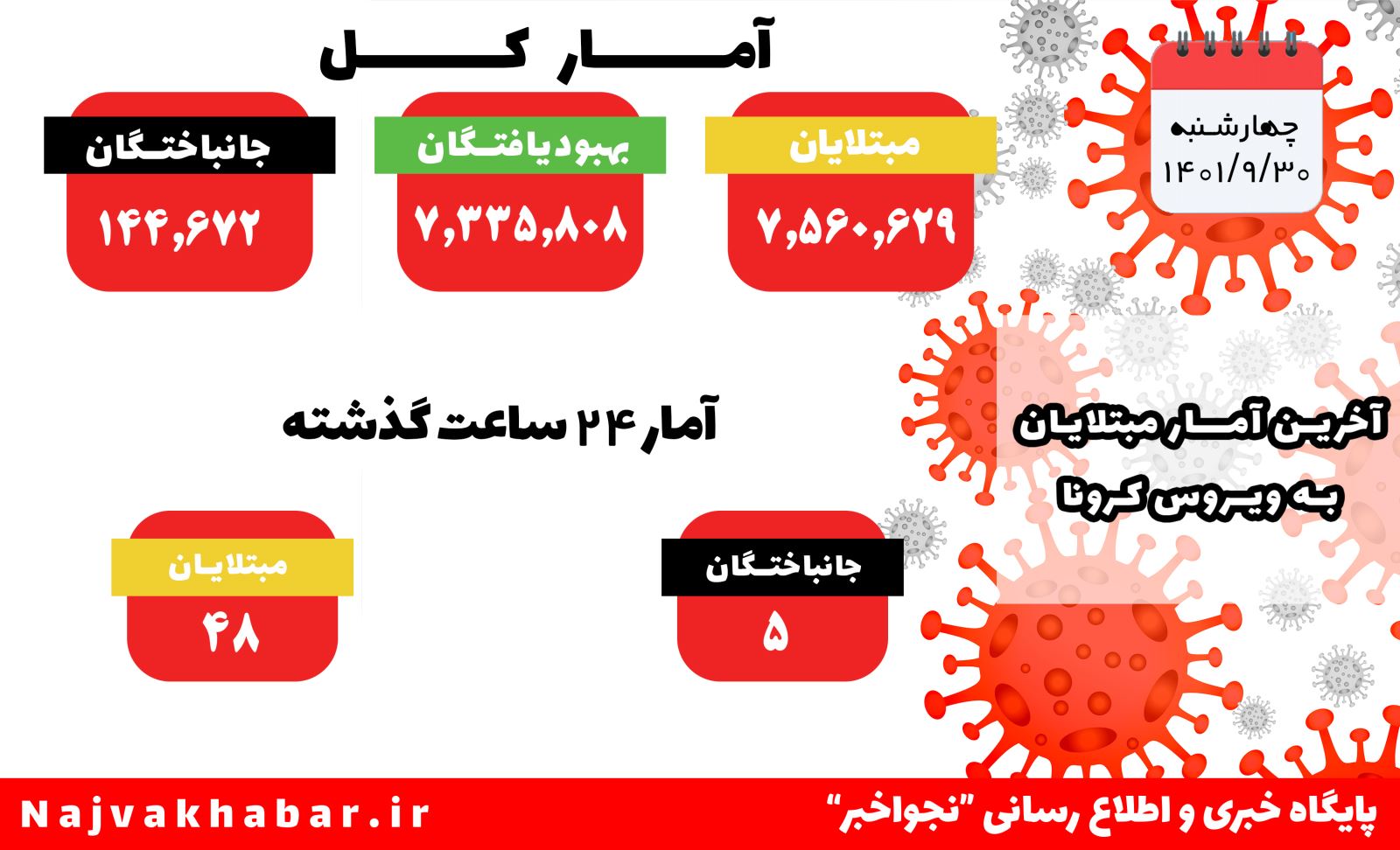 در طول ۲۴ ساعت گذشته، ۵ نفر از بیماران کووید ۱۹ در کشور جان خود را از دست دادند و مجموع جان باختگان این بیماری، به ۱۴۴ هزار و ۶۷۲ نفر رسید.
