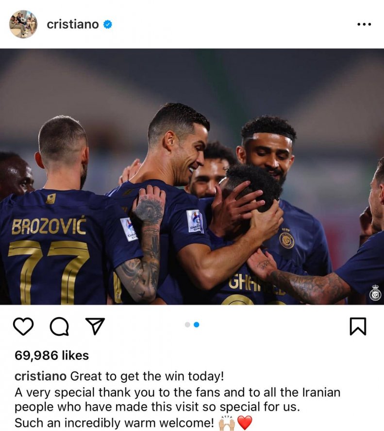 کریستیانو رونالدو، فوق ستاره دنیای فوتبال، پس از پیروزی تیمش مقابل پرسپولیس در پستی اینستاگرامی از این استقبال تشکر کرد و نوشت: