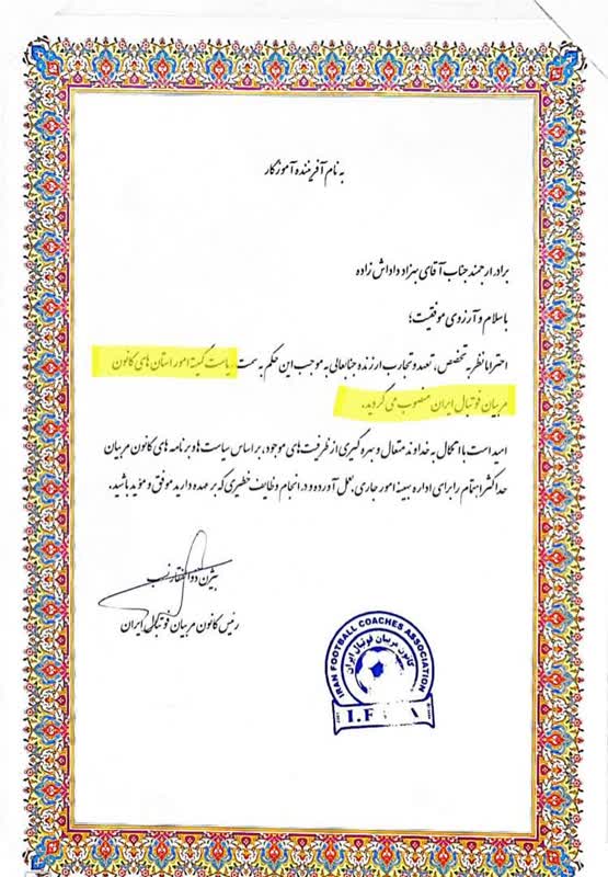 دکتر بیژن ذوالفقارنسب جناب آقای بهزاد داداش زاده نماینده کانون مربیان فوتبال گیلان به سمت مسئول امور شهرستان های کانون مربیان فوتبال ایران انتخاب شدند.