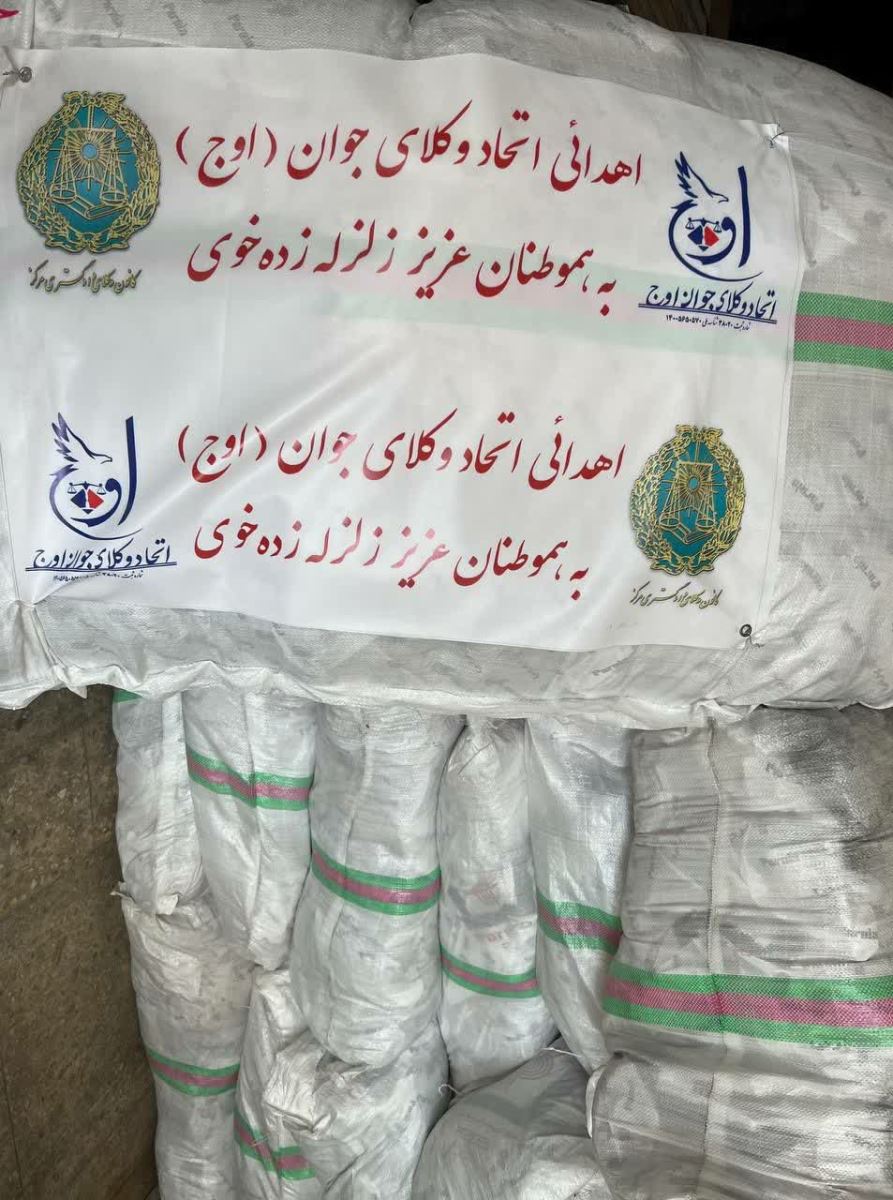 اتحاد وکلای جوان (اوج) در راستای همدردی و کمک به هموطنان زلزله زده در خوی، اقلامی شامل پتو ، پوشک و اقلام بهداشتی بانون به ارزش بیش از 3 میلیارد ریال را از طریق کانون وکلای دادگستری مرکز به این مناطق ارسال کرد .
