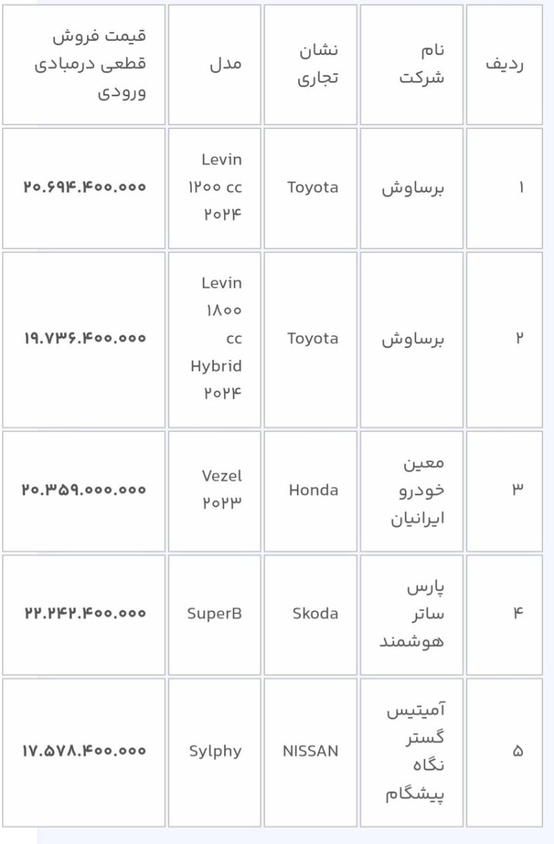 جدول شماره ۱: قیمت فروش محاسباتی قطعی خودروهای وارداتی در مبادی ورودی واحد: دستگاه / ریال
