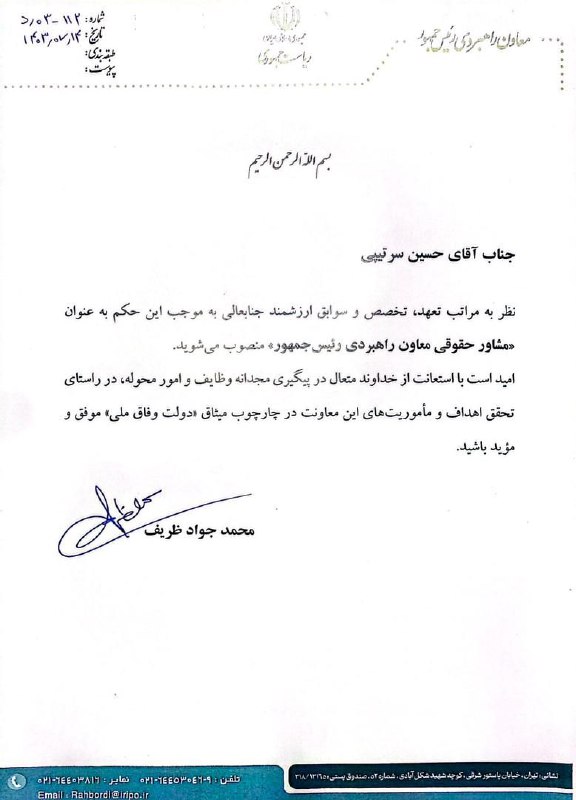به گزارش نجوا خبر، محمد جواد ظریف در حکمی، حسین سرتیپی را به مقام مشاور حقوقی معاون راهبردی رئیسجمهور منصوب کرد.