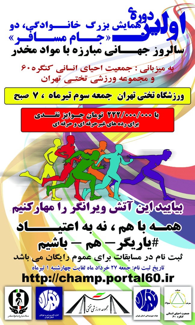 این همایش در دو رده حرفهای و آماتور( آقایان و بانوان)به میزبانی جمعیت احیای انسانی کنگره۶۰ و مجموعه ورزشی تختی تهران و با نظارت و مشارکت اداره کل ورزش و جوانان استان تهران- ستاد مبارزه با مواد مخدر کل کشور و هیئت دوومیدانی استان تهران برگزار میشود.