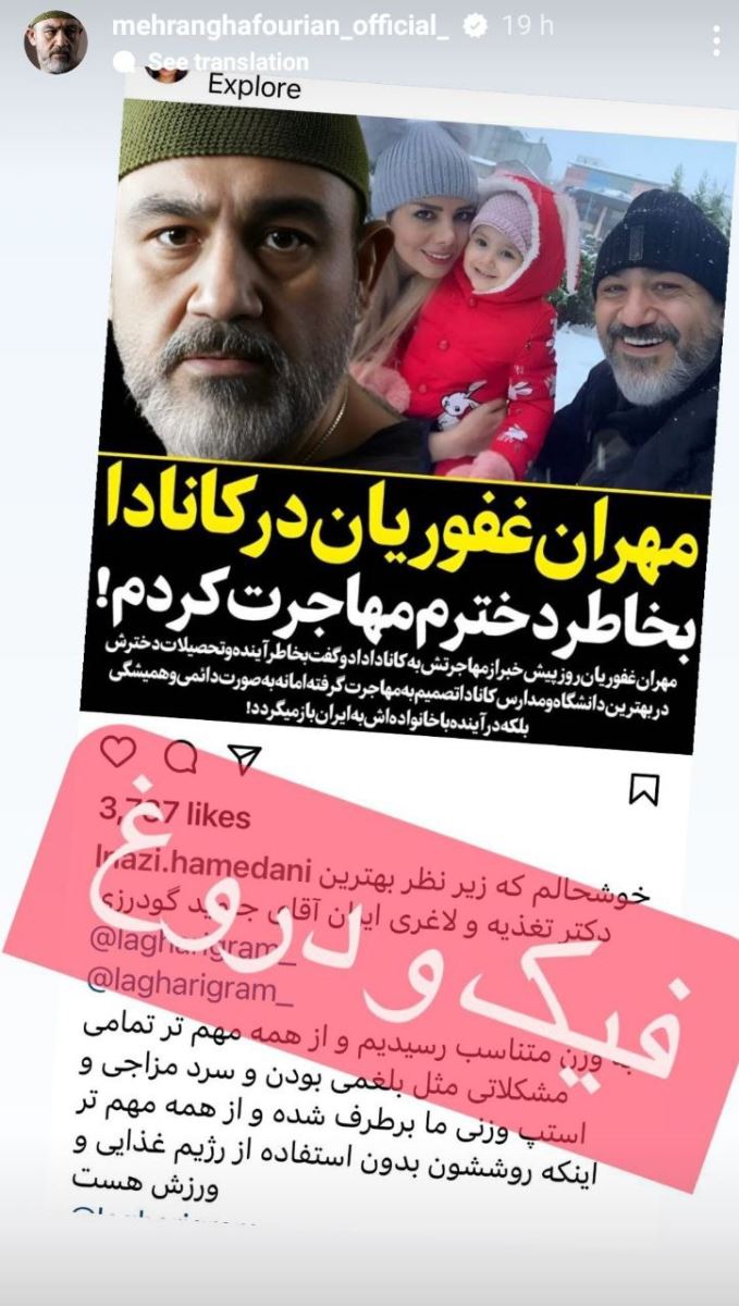 مهران غفوریان، بازیگر سرشناس کمدی با انتشار یک استوری شایعه مهاجرتش را تکذیب کرد.