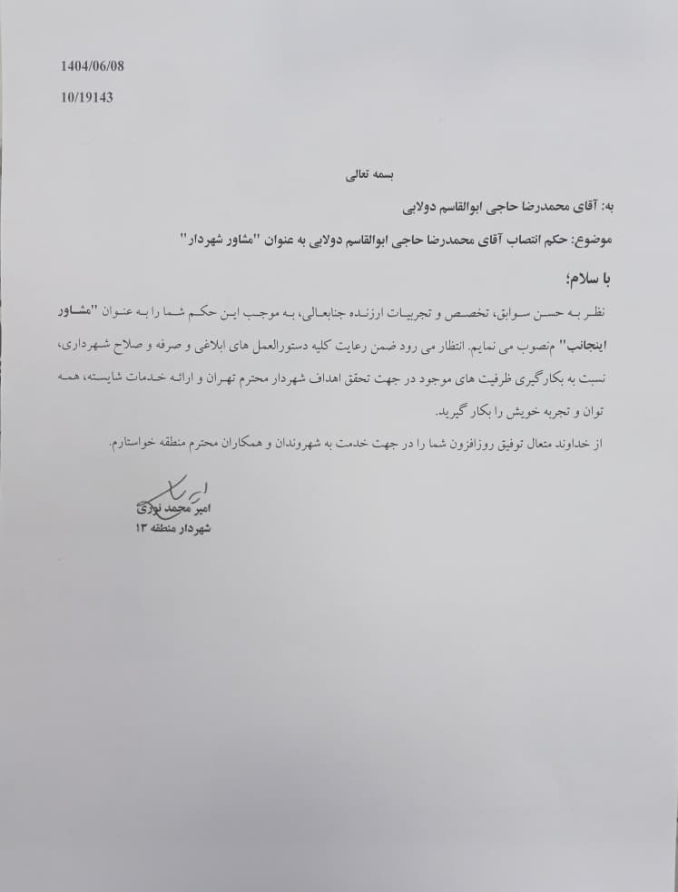 به گزارش نجوا خبر، محمدرضا حاجی ابوالقاسم دولابی به عنوان مشاور شهردار منطقه 13 منصوب شد.