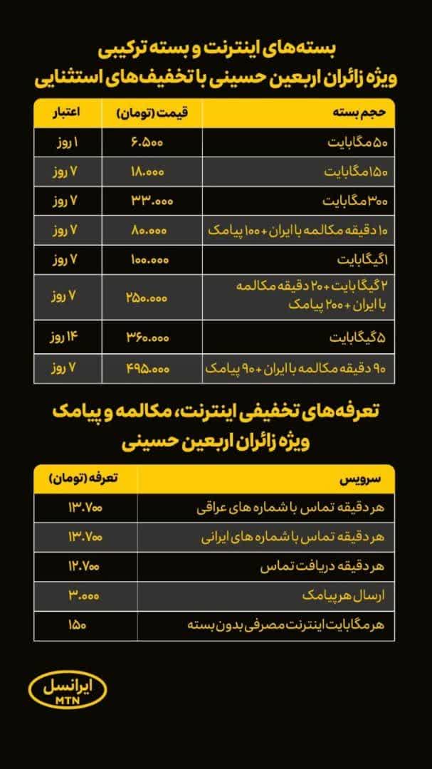 بستههای اینترنت رومینگ ارائه شده توسط ایرانسل، که با هدف رفاه و آسایش بیشتر و تسهیل در ارتباطات زائران در ایام اربعین سرور و سالار شهیدان، از طریق اپراتورهای Zain و Asiacell در نظر گرفته شده است، شامل بسته ۵۰ مگابایتی یک روزه با قیمت ۶هزار و پانصد تومان، بسته ۱۵۰ مگابایتی هفت روزه با قیمت ۱۸هزار تومان، بسته ۳۰۰ مگابایتی هفت روزه با قیمت ۳۳هزار تومان، بسته یک گیگابایتی هفت روزه با قیمت ۱۰۰هزار تومان و بسته پنج گیگابایتی ۱۴ روزه با قیمت ۳۶۰هزار تومان هستند.